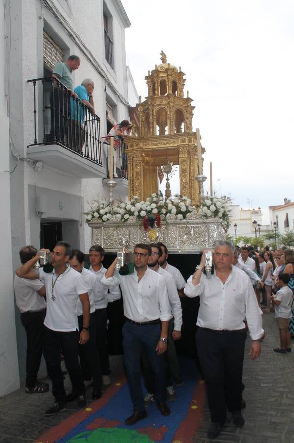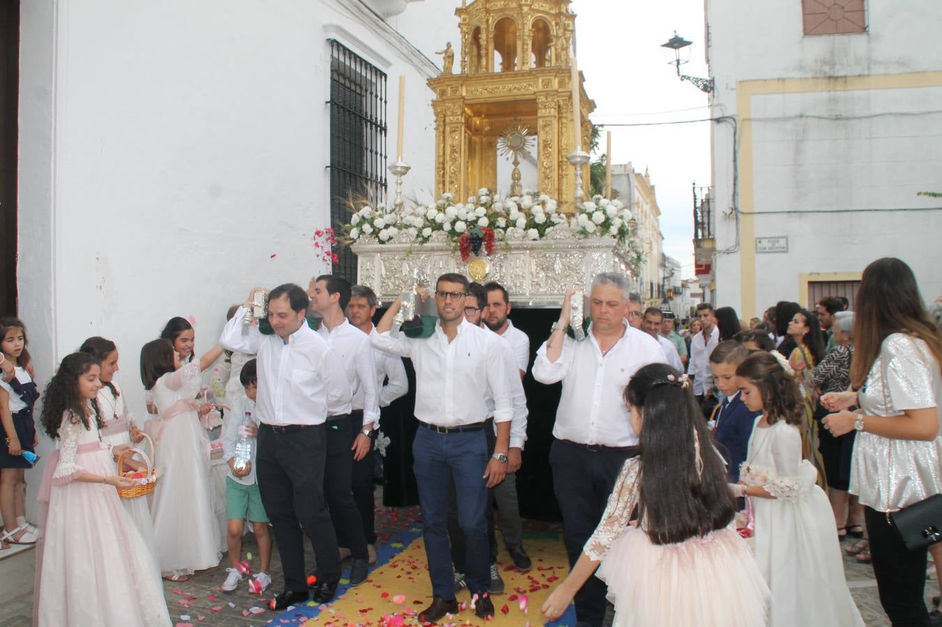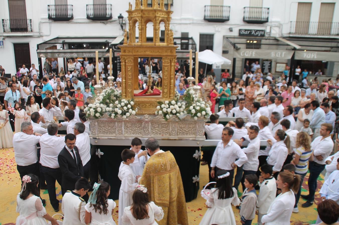 Jerez de los Caballeros celebró ayer la festividad del Corpus Christi en medio de un ambiente de solemnidad y convivencia del que fueron partícipes cientos de personas.La iglesia visigoda de Santa María de la Encarnación, llena de fieles, acogió la celebración de la Eucaristía que dió paso a la procesión acompañando la Santa Custodia en el magnífico templete de la iglesia de San Miguel, sobre las andas de la Virgen de Aguasantas y portada por costaleros y costaleras de la recién Asociación creada en esta ciudad. El párroco, Antonio María Rejano, destacó la significación de esta procesión, lamás grande, dijo, «porque Jesús sale a nuestras vidas, a nuestro encuentro y nosotros le acompañamos». Al término de la misa, incidió en el agradecimiento a todas las personas que han participado para hacer posible su desarrollo, trabajando desde la jornada del sábado en la elaboración de las preciosas alfombras de sal teñida de colores, que lucieron en las calles del centro de Jerez. El agradecimiento fue especial para los padres y madres de los niños y niñas que han hecho la Primera Comunión, para éstos mismos, también para catequistas, Cofradías y Hermandades, la Asociación del costaleros y costaleras de la Semana Santa de Jerez de los Caballeros, Ayuntamiento, Policía Local, grupos y personas de la parroquia.Autoridades civiles en representación del Ayuntamiento, Policía Local y Guardia Civil, acompañaron el desarrollo de la procesión junto a representantes de todas las cofradías y hermandades jerezanas y el protagonismo de los más de 80 niños y niñas que este año han celebrado su Primera Comunión.